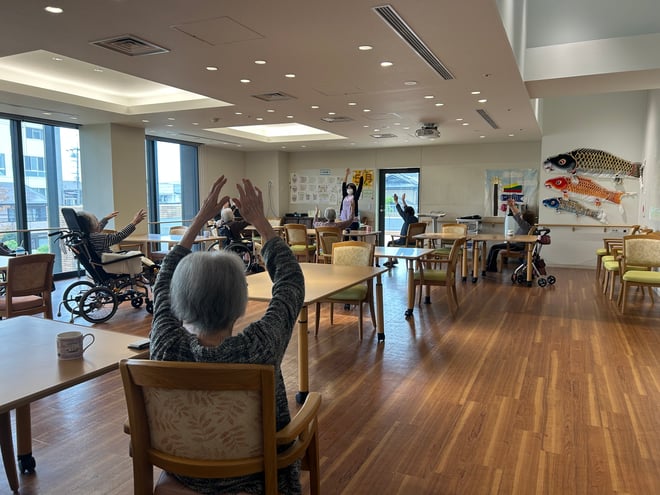 朝のラジオ体操 2025年5月21日 博愛ナーシングヴィラ event 目次 湿度の高い、ジメジメとした日が続きますね。やっと暖かくなった!と思ったら、もう梅雨の話題に。月日が過ぎるのが早くてついていけません😳 博愛のご入居者は、今日も元気にラジオ体操に励んでいらっしゃいました🙌 前の方の方は手がしっかり伸びていますね😊 職員が少しお手伝い💪 身体をしっかり動かして、昼食に備えましょう🙌😋
