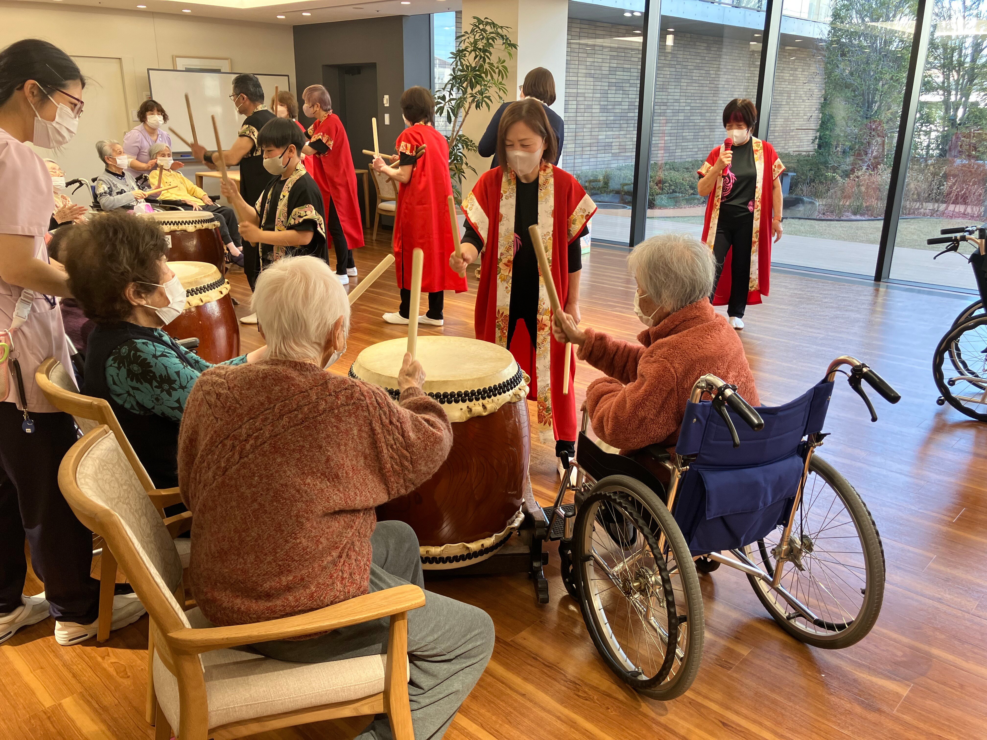 最後はご入居の皆様にも太鼓のバチを持っていただいて、皆さんで演奏を楽しみました😄👏