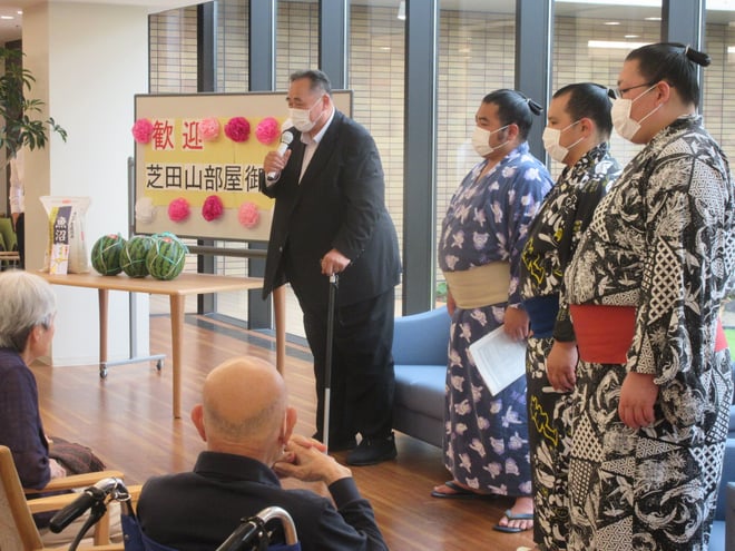 芝田山部屋来園 2024年7月4日 博愛ナーシングヴィラ NEWS イベント 目次 7月3日芝田山部屋の訪問がありました芝田山親方、お弟子さん3名、行司、呼び出し、床山の計7名の方がいらっしゃいました。 親方の面白いお話や、床山による「まげ結い」の実演、行司にその場で書いていただいた色紙や、呼び出しの実演など、盛りだくさんの内容でとても楽しい時間となりました。 エントランス受付カウンターに色紙とご入居者全員にいただいた手ぬぐいを飾っています。また、1階ダイニングに写真をたくさん掲示しました。ご面会の際に是非、ご覧ください😊