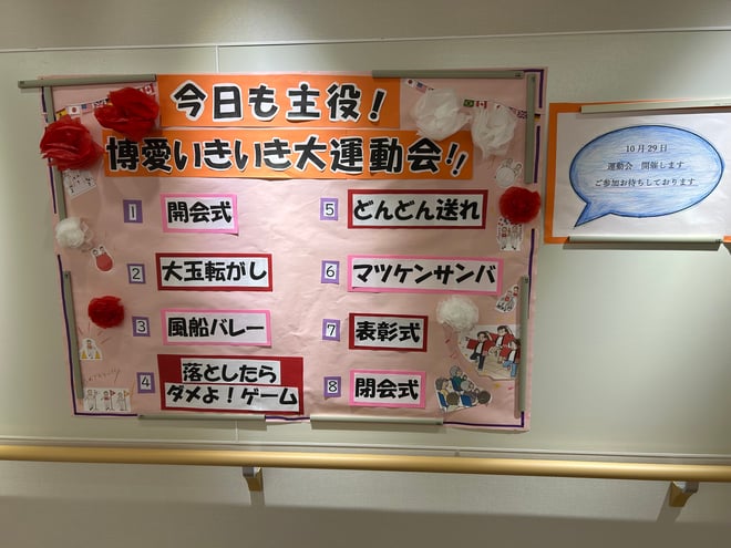 運動会に向けて🏴 2025年10月14日 博愛ナーシングヴィラ NEWS event 目次 再来週の10月29日、博愛では大運動会が開催されます! ただの運動会ではありません。大運動会です!!!😀👍 ご入居の皆様は気合十分で、日々練習に励んでいます✨ マツケンサンバの振り付けや💫 競技練習の様子。練習といえど、熱が入って皆様とても真剣に取り組んでいらっしゃいます。 飾りつけもバッチリです😊🍂 本番はどんなドラマが繰り広げられるのか!いまからとっても楽しみです😉💪