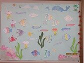 魚やくらげなどの塗り絵に、色鉛筆で自由に塗っていただきました。好きな場所に貼っていただき、とてもカラフルで楽しそうな海の中を表現できました。お食事をするラウンジに飾らせていただいています。